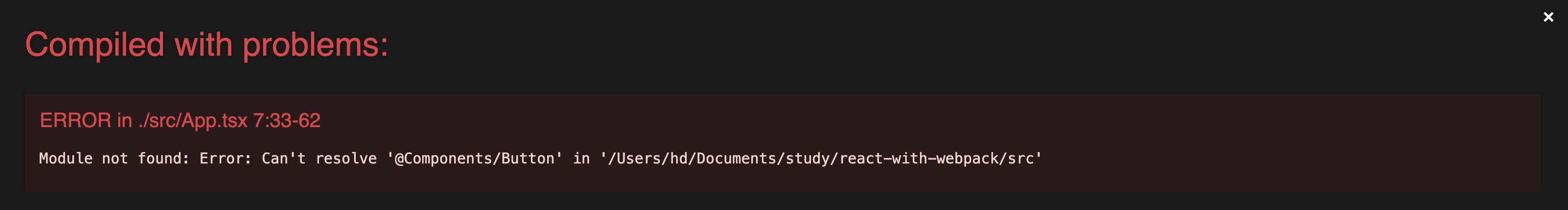 절대 경로를 사용하면 잘 불러와지는 것을 볼 수 있다. 하지만 yarn dev로 서버를 실행시키면 다음과 같이 컴파일 오류가 나타난다. 그 이유는 웹팩에 절대경로를 알려주지 않았기 때문이다.