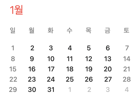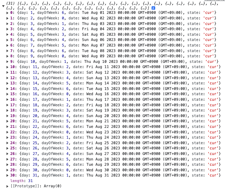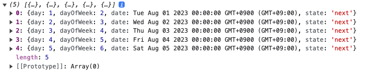 ๊ฐ์ฒด๋ฅผ ์ดํด๋ณด๋ฉด ์ผ์ ์๋ฏธํ๋ day, ์์ผ์ ์๋ฏธํ๋ dayOfWeek, Date ๊ฐ์ฒด์ธ date ๊ทธ๋ฆฌ๊ณ ์ด์ ๋ฌ์ ์๋ฏธํ๋ prev๊ฐ ์์ต๋๋ค. ๊ฐ๋จํ๊ฒ date๋ง ํ์ํ ์ ์์ต๋๋ค. ํ์ง๋ง ์ดํ์ ์คํ์ผ๋ง์ ํ ๋ ์กฐ๊ธ ๋ ์์ํ๊ฒ ํ๊ธฐ ์ํด dayOfWeek, state๋ฅผ ์ถ๊ฐํ์ต๋๋ค.