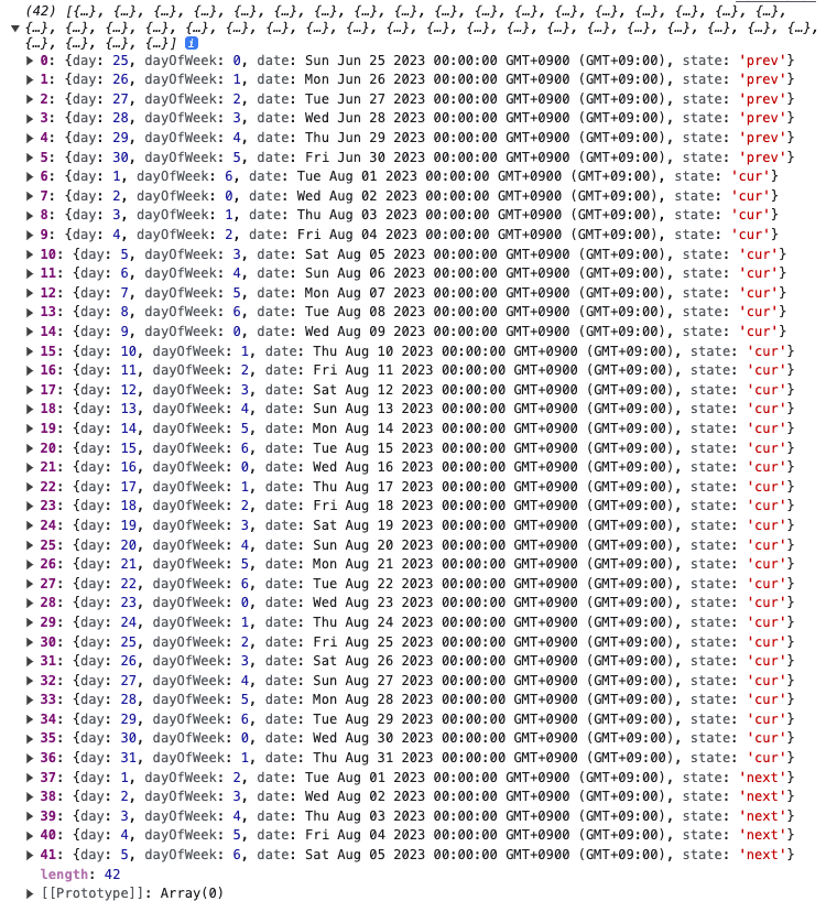 ๊ฐ์ฒด๋ฅผ ์ดํด๋ณด๋ฉด ์ผ์ ์๋ฏธํ๋ day, ์์ผ์ ์๋ฏธํ๋ dayOfWeek, Date ๊ฐ์ฒด์ธ date ๊ทธ๋ฆฌ๊ณ ์ด์ ๋ฌ์ ์๋ฏธํ๋ prev๊ฐ ์์ต๋๋ค. ๊ฐ๋จํ๊ฒ date๋ง ํ์ํ ์ ์์ต๋๋ค. ํ์ง๋ง ์ดํ์ ์คํ์ผ๋ง์ ํ ๋ ์กฐ๊ธ ๋ ์์ํ๊ฒ ํ๊ธฐ ์ํด dayOfWeek, state๋ฅผ ์ถ๊ฐํ์ต๋๋ค.