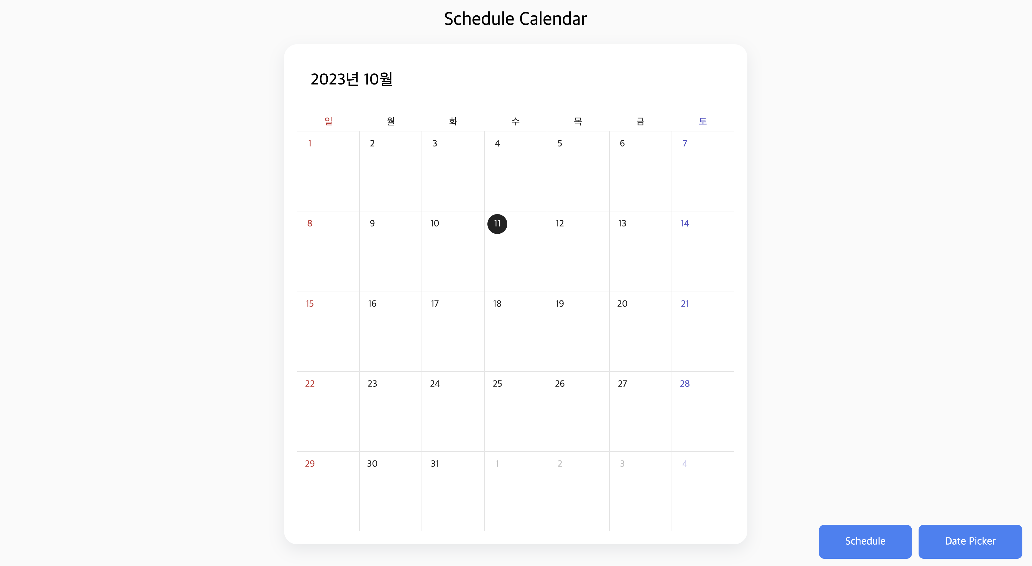 feat: ๋ผ์ด๋ธ๋ฌ๋ฆฌ ์์ด ์๋ฐ์คํฌ๋ฆฝํธ๋ก ๋ฌ๋ ฅ ๋ง๋ค๊ธฐ 2 - Schedule, Date Picker ๋ง๋ค๊ธฐ · nlom0218/vanilla-cale